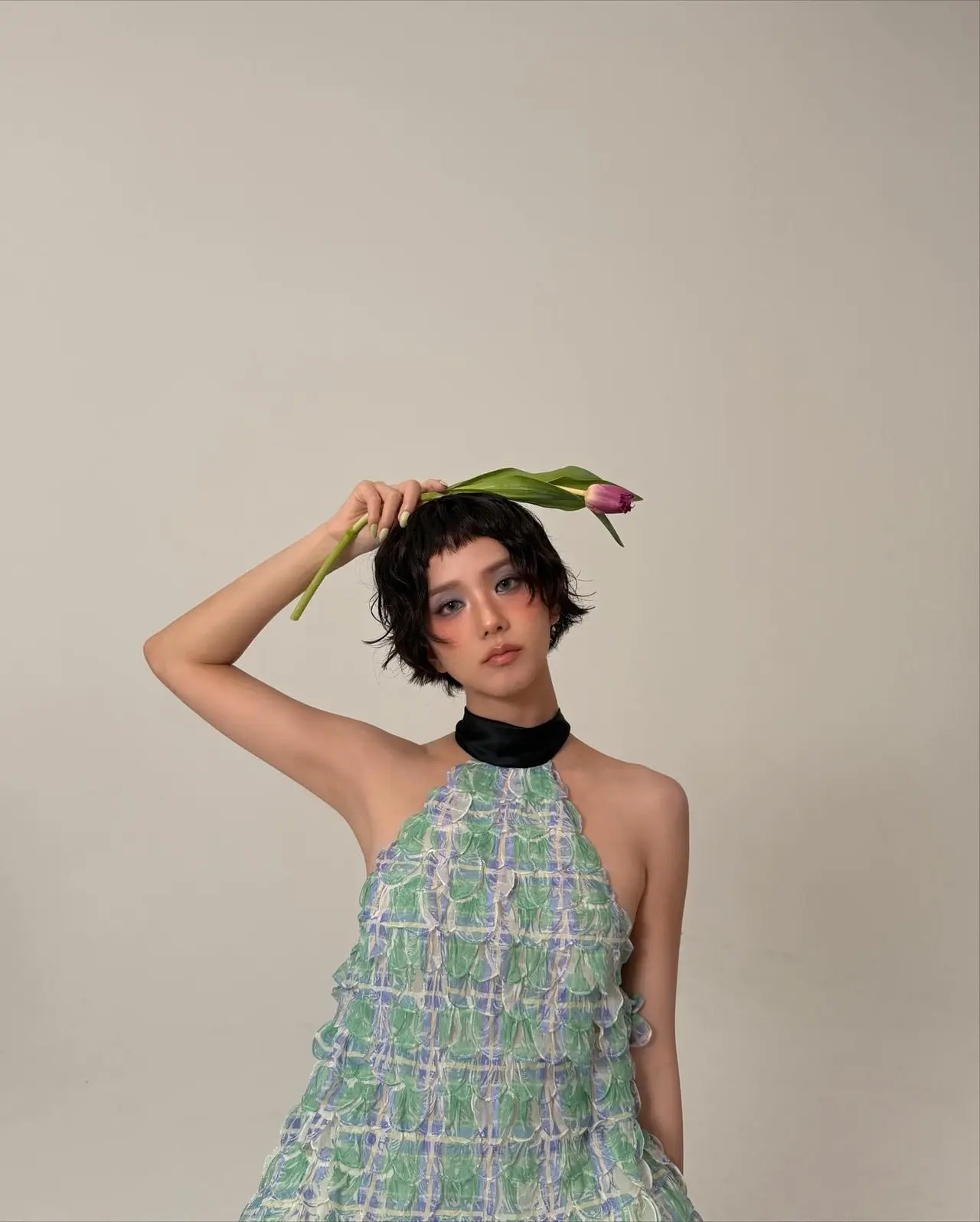 今回一緒に公開された写真には、緑色と紫のホルターネックワンピースを着てスタジオで撮影に臨んでいるJISOOの姿が込められている。