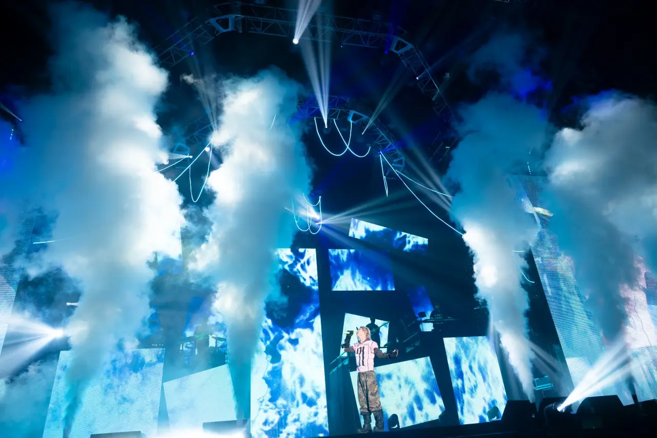 オープニングからKEYは破格のカリスマ性を誇示した。映像が投影されていたメインステージを覆う紗幕が落ちると、いくつものモニターが設置されたステージセットが露わとなり、その中央の天井付近にいるKEYのシルエットが目に飛び込んできた。よく見ると宇宙船のようなセットの中にいて、超合金ロボットを模したようなシルバーがメインの衣装をまとっている。目の前の何かをにらみつけるような表情を見せながら、『HUNTER』の収録曲「Strange」を歌う。生バンドの演奏によって原曲よりもダイナミックになったサウンドと、ロートーンからハイトーンまでを行き来する歌声が曲をドラマティックに彩っていく。宇宙船が徐々に降下してステージに着地すると、ダンサーを従えて息遣いから一気に高音パートへと移行して始まる「Helium」へ。ここから一気に7曲目までMCを挟むことになくパフォーマンスした。